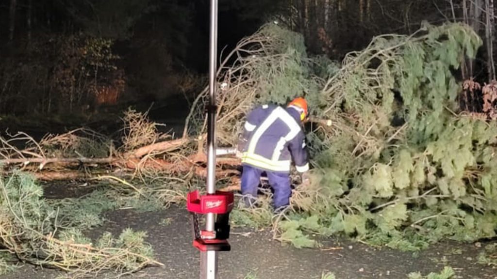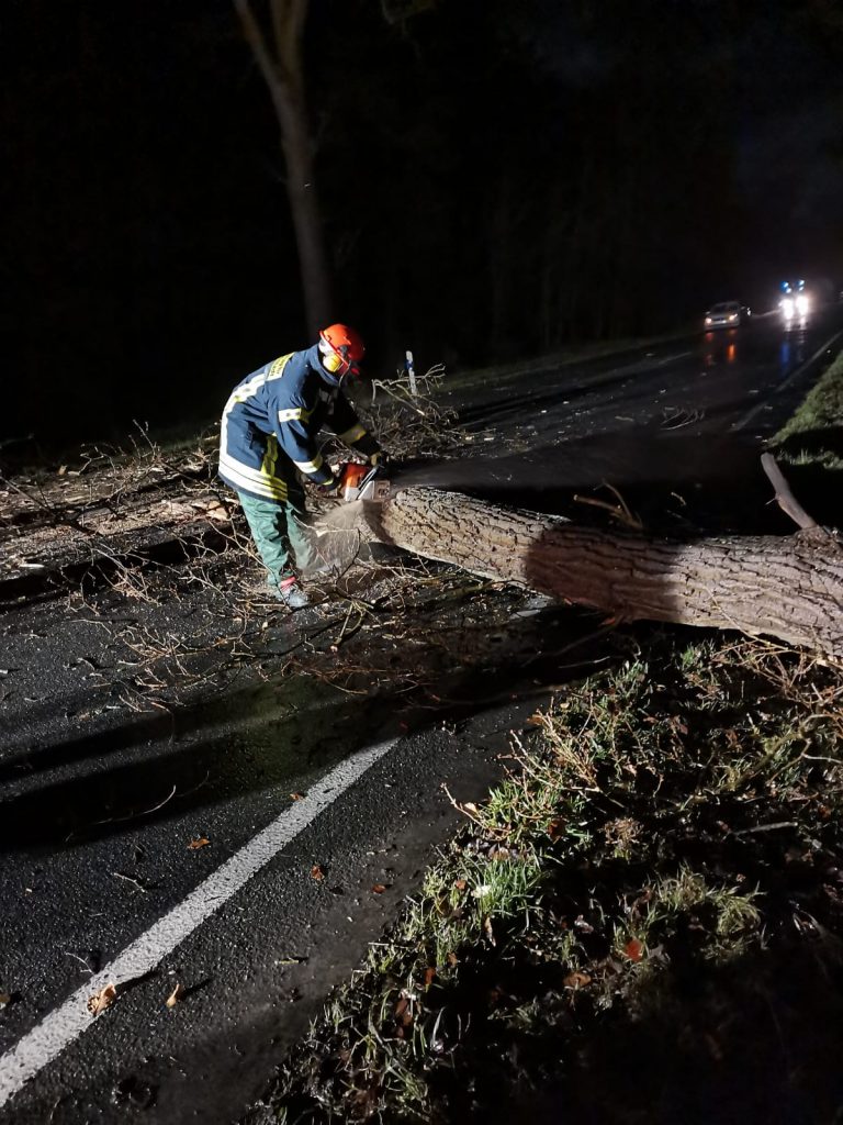 Der zweite Einsatz bei der Sturmlage rief uns auf die B493 Richtung Tatern. Der Baum versperrte die Fahrbahn komplett. Für die Dauer des Einsatzes haben wir die Bundesstraße voll gesperrt.